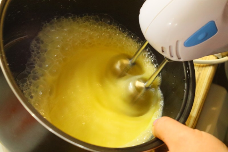 2. Dodaj cukier do masy jajecznej i ubijaj mikserem przez 2 minuty.