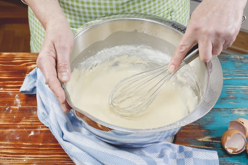 3. Dodaj mleko, olej i mąkę. Potem proszek do pieczenia i sok z połowy cytryny. Dokładnie wymieszaj na gładką masę.