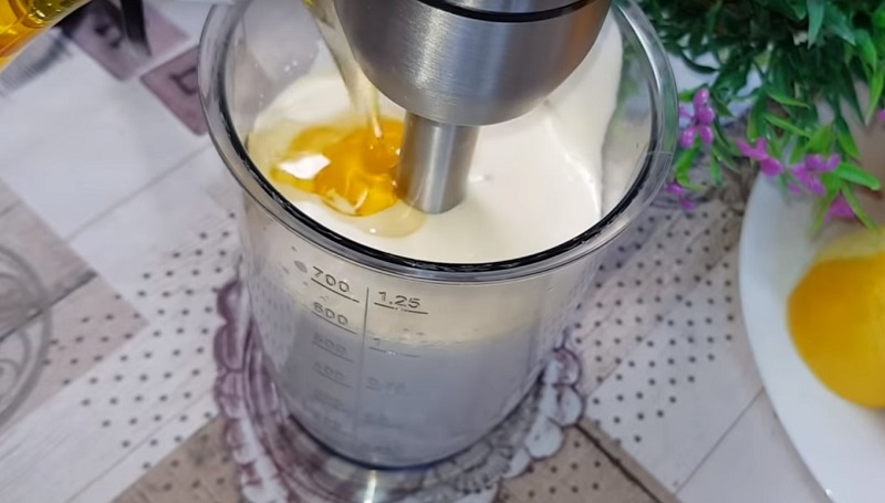 6. Aby zapobiec rozwarstwieniu się sosu (zważenia) wlej olej słonecznikowy cienkim strumieniem (najlepiej w kilku krokach).