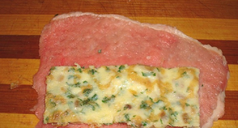 4. Po ostygnięciu, omlet pokrój na kawałki i ułóż na każdym ubitym kotlecie.