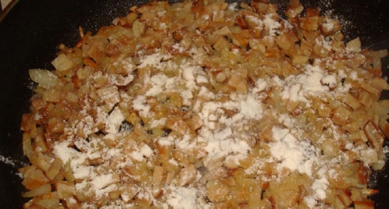8. Czas przygotować sos! Pokrój cebulę w kostkę, borowiki na mniejsze części. Smaż na oleju do momentu, kiedy cebulka się zeszkli, a następnie dodaj grzyby. Smaż przez kilka minut. Potem dodaj mąkę i wszystko dokładnie wymieszaj.