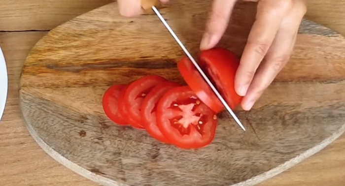 3. Czas na nadzienie: Obierz czosnek i drobno go pokrój lub przeciśnij przez praskę. Pomidory pokrój w plastry ok. 5 mm. Drobno posiekaj zioła.