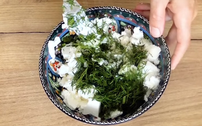 4. Rozetrzyj ser feta widelcem i dodaj do niego zioła i czosnek, wymieszaj pastę.