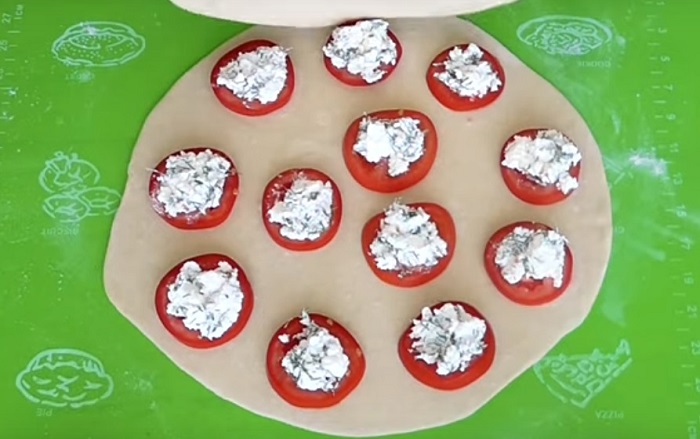 5. Podziel ciasto na 4 części, każdą rozwałkuj na cienki placek. Poukładaj na nim pomidory, zachowując 2,5 cm. odstęp. Na każdym plasterku pomidora połóż pastę z sera feta z ziołami.
