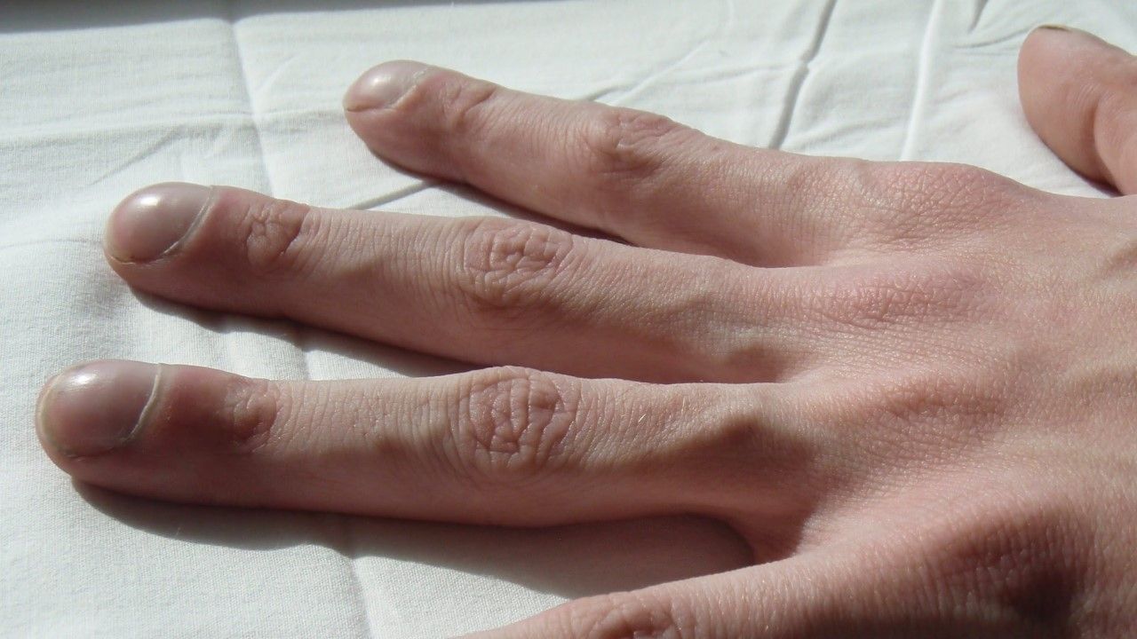 - Palce pałeczkowate – pogrubienie i poszerzenie końcówek palców;