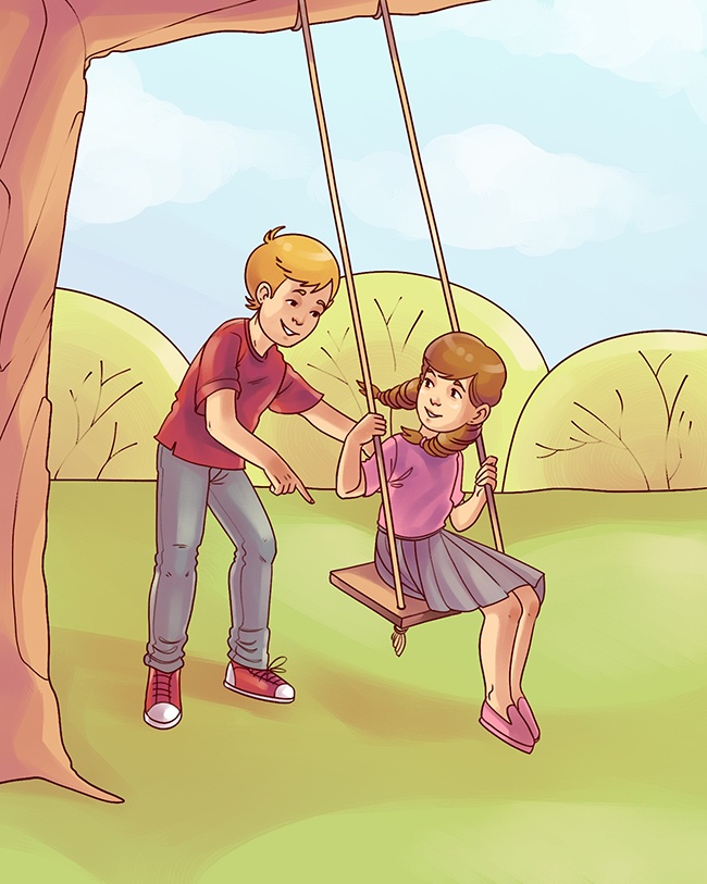 Zwróćcie uwagę na to, jak zawiązana jest huśtawka. Dziewczynka nie mogłaby się na niej huśtać, wypadałby do tyłu.