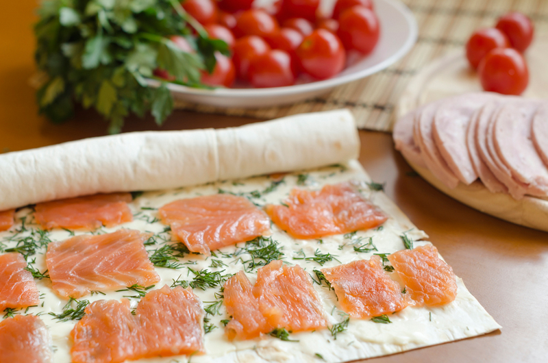 Posmaruj tortill rozgniecionym twarożkiem śmietankowym, posyp koperkiem i poukładaj na wierzchu rybę. zawiń w rulon.Gotowe!