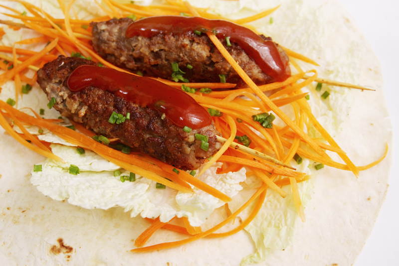 Na tortillę połóż sałatę, startą marchewkę. Na środku ułóż kotleciki z mięsa mielonego posmarowane keczupem i musztardą. Zawiń całość i usmaż na grillu.