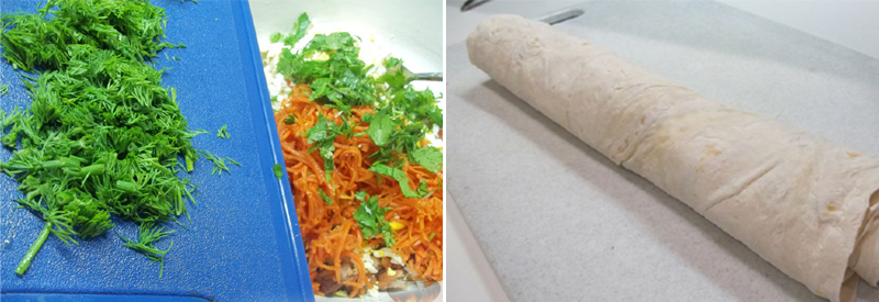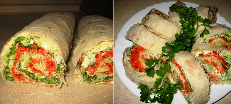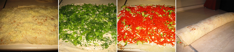 3. Zwiń tortillę ciasno w rolkę. Warstwy możesz wykonać w dowolnej kolejności.