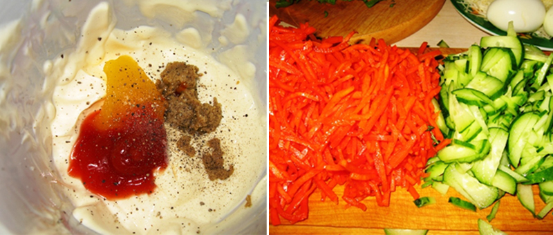 1. Ugotuj lub podsmaż fileta z kurczaka z przyprawami. Ugotuj jajka. Koreańska marchewka musi być zrobiona z wyprzedzeniem i użyta po wyciśnięciu z marynaty. Paprykę razem z innymi warzywami pokrój w paski lub plasterki.