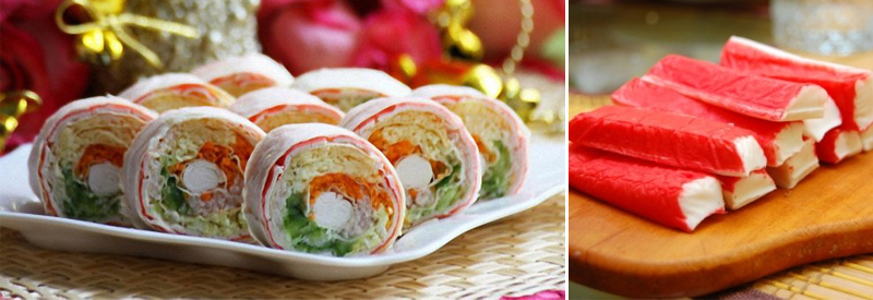 3. Na trzeciej,posmarowanej majonezem, dodaj pokrojone drobno paluszki krabowe (rozłóż je na całej powierzchni). Owiń szczelnie dwie wcześniej zwinięte tortille.