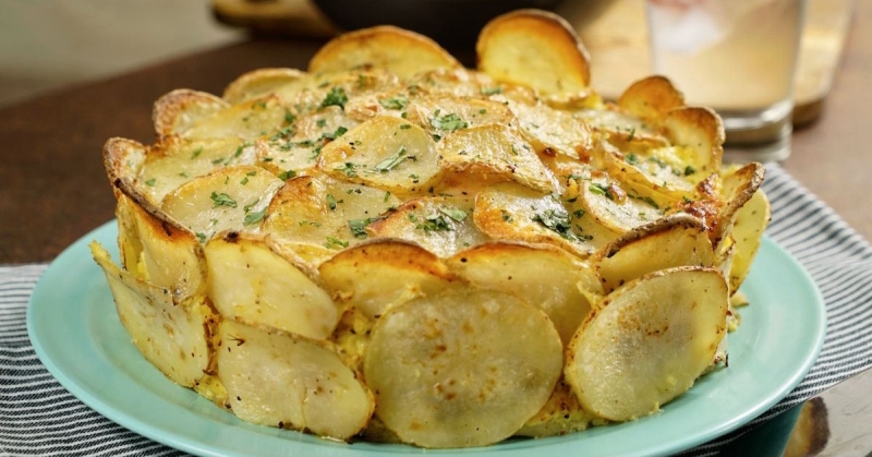 6. Napełnij blaszkę masą jajeczną, przygotowaną wcześniej, ułóż ostatnią warstwę ziemniaków na wierzchu. Piecz w piekarniku przez 40 minut, a następnie zdejmij boki formy. W tej postaci wstaw zapiekankę do piekarnika i piecz przez kolejne 10 minut, aż ziemniaki się przypieką.