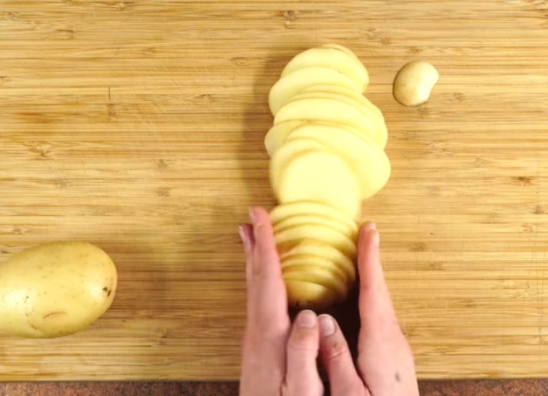 2. Ziemniaki umyj i obierz, pokrój w plastry o grubości 0,5 cm, w tym celu lepiej użyć dobrze naostrzonego noża.