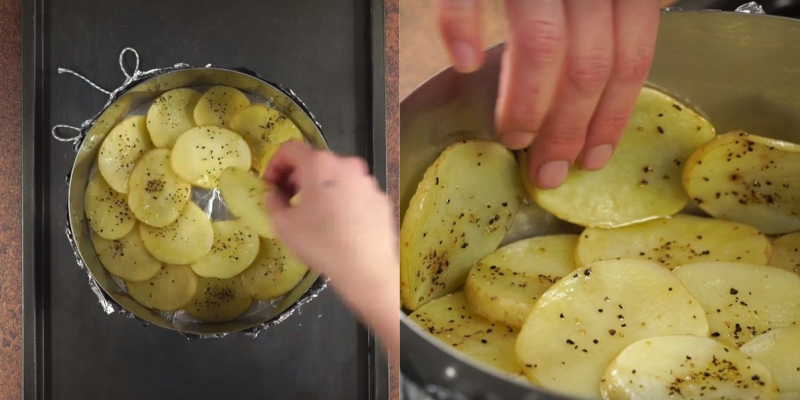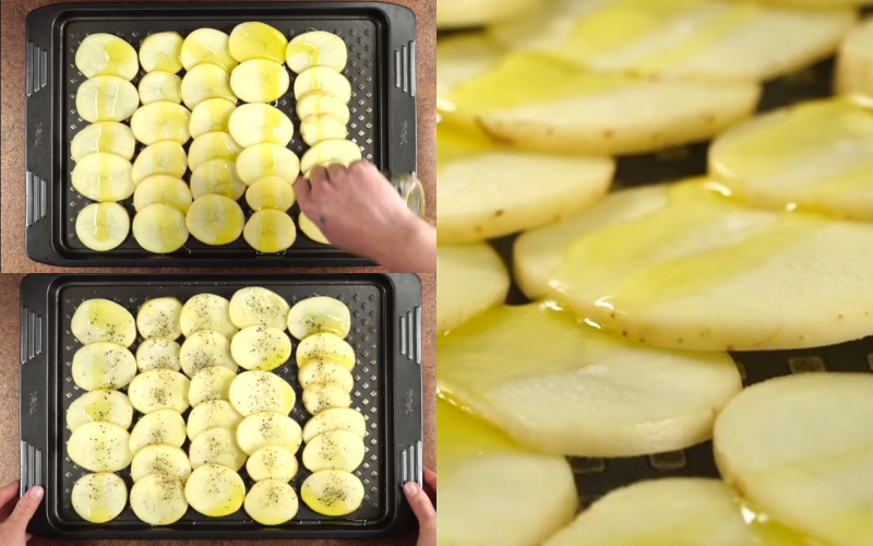 3. Ziemniaki będą pieczone w dwóch etapach, ale nie martw się bo pierwszy etap nie zajmuje wiele czasu. Pokrojone plasterki ziemniaków rozłóż na blaszce do pieczenia, polej oliwą z oliwek, posól, popieprz i piecz w piekarniku 10 minut. Ziemniaki będą wtedy miękkie i delikatne.