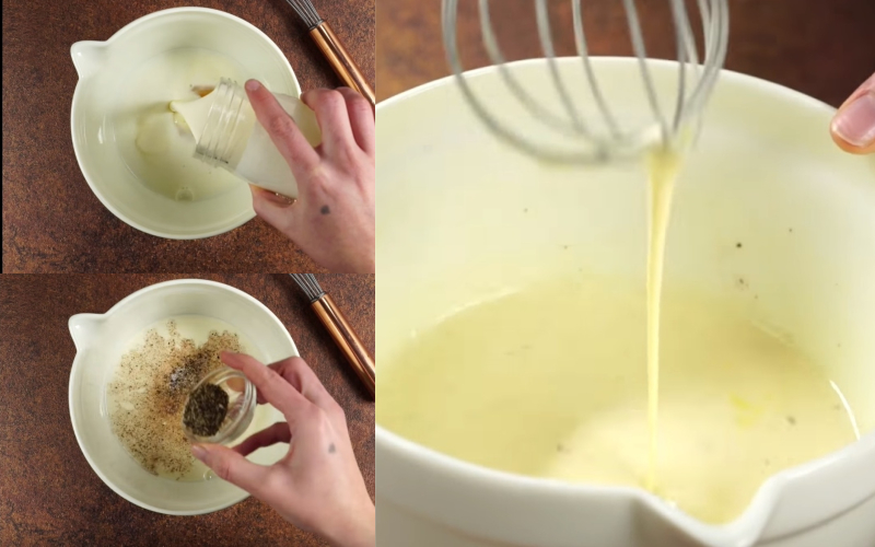 4. W misce roztrzep jajka, dodaj śmietanę, mleko, gałkę muszkatołową, Posól i popieprz do smaku.