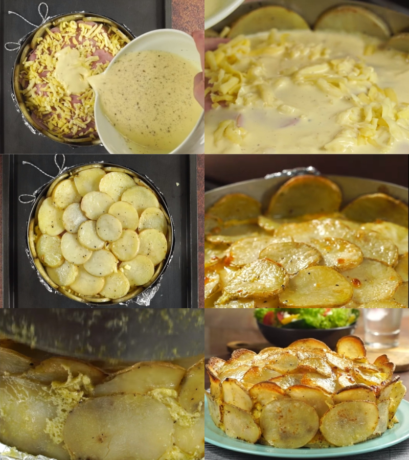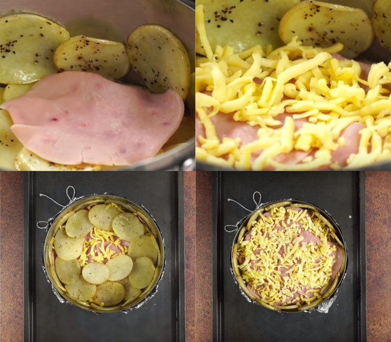 5. Wyjmij ziemniaki z piekarnika i poukładaj plastry na dnie okrągłej formy oraz po jej bokach. Następnie ułóż plastry szynki, posyp startym serem. Powtarzaj układanie warstwa po warstwie a samą górę posyp pozostałym serem.